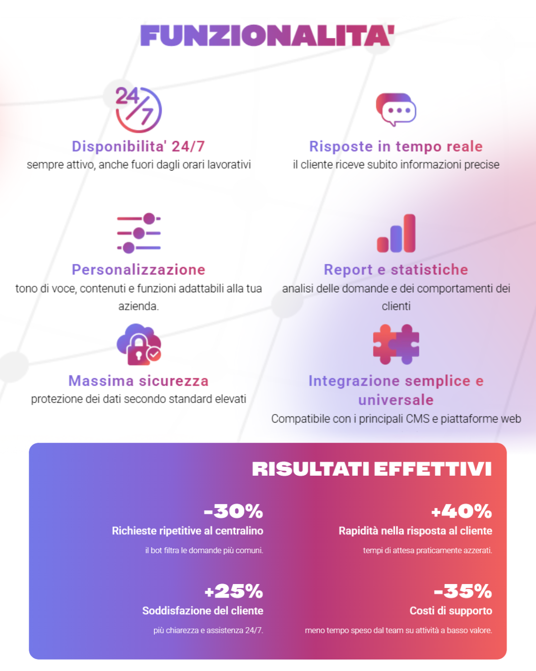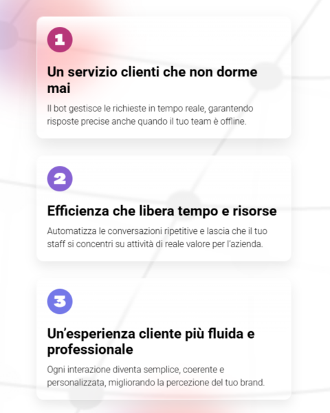 Il nostro bot AI ColloquIA è un assistente virtuale intelligente, progettato per rispondere in tempo reale alle domande dei tuoi clienti.