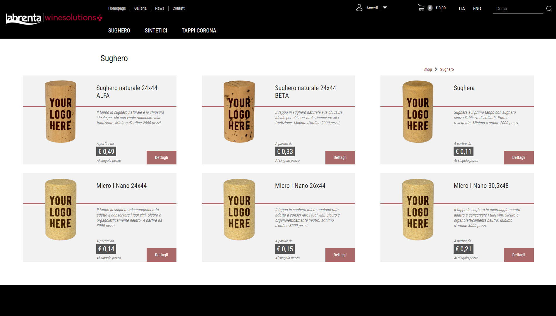 L'utente potrà scegliere tra tappi in sughero, sintetici o tappi corona e customizzare attraverso pochi click il prodotto con il logo o il nome della cantina.