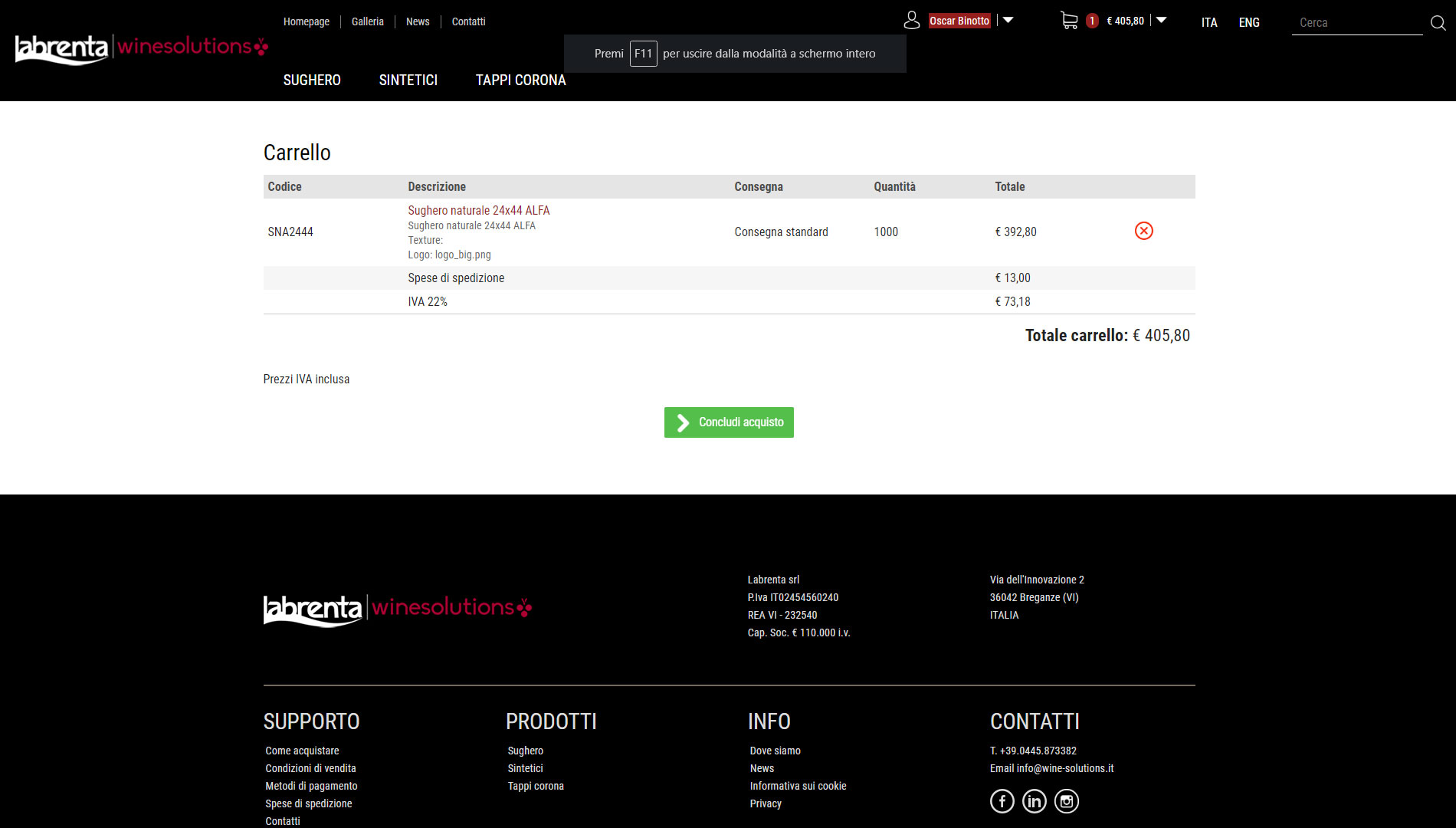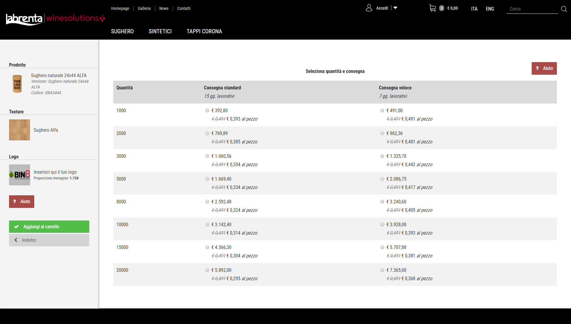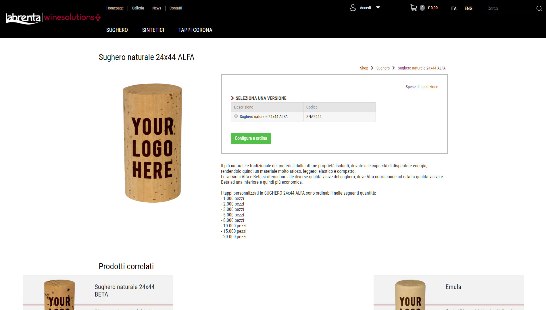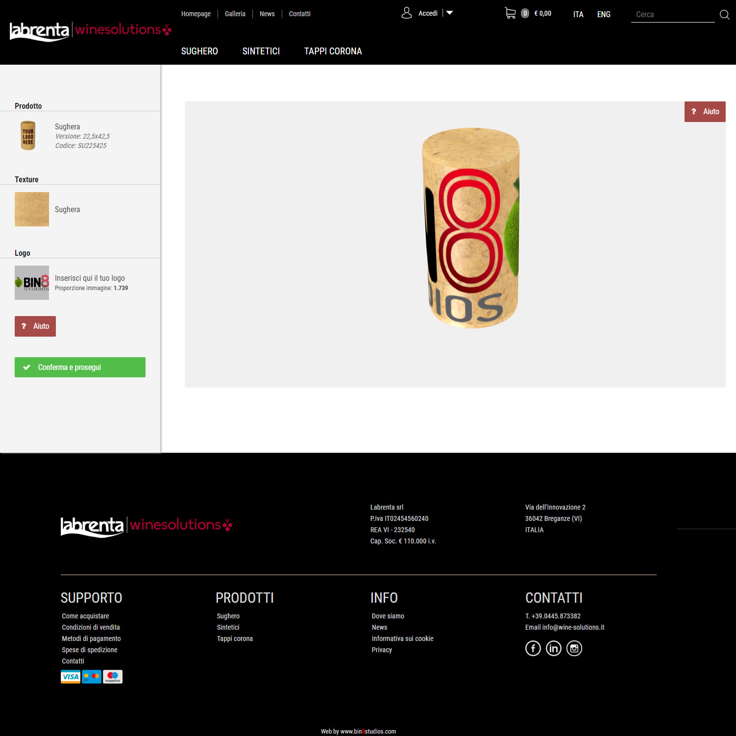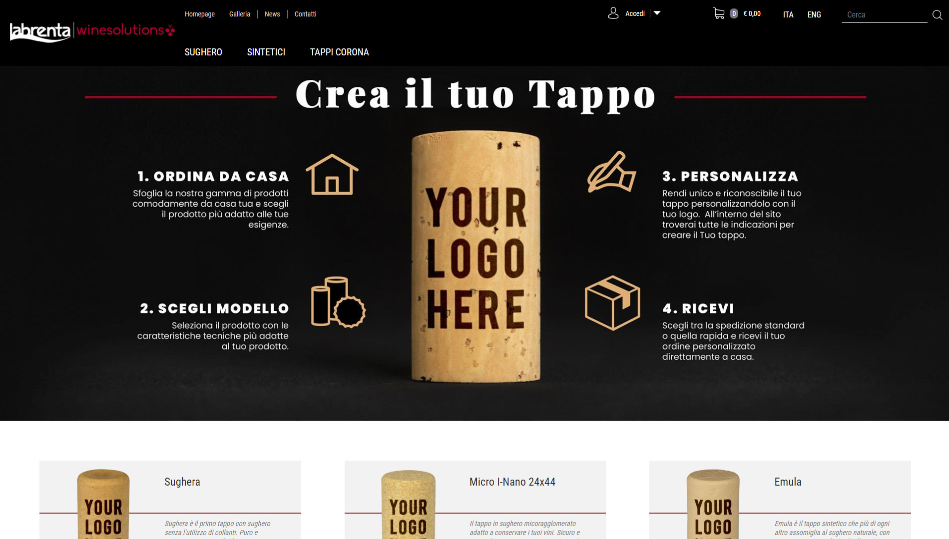 L'utente potrà scegliere tra tappi in sughero, sintetici o tappi corona e customizzare attraverso pochi click il prodotto con il logo o il nome della cantina.